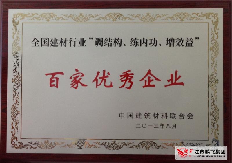 為樹立典型,有效遏制經(jīng)濟效益下滑,推進建材行業(yè)調(diào)整結構和轉(zhuǎn)型升級,弘揚正能量,發(fā)揮優(yōu)秀企業(yè)的典型示范作用,促進行業(yè)科學發(fā)展,中國建材聯(lián)合會與各省市地方建材行業(yè)協(xié)會聯(lián)手開展推薦表彰“調(diào)結構、練內(nèi)功、增效益”百家優(yōu)秀企業(yè)評比表彰活動。江蘇鵬飛集團強抓市場機遇,堅持科學發(fā)展之路,創(chuàng)新經(jīng)營模式,被授予“調(diào)結構、練內(nèi)功、增效益”百家優(yōu)秀企業(yè)榮譽稱號。