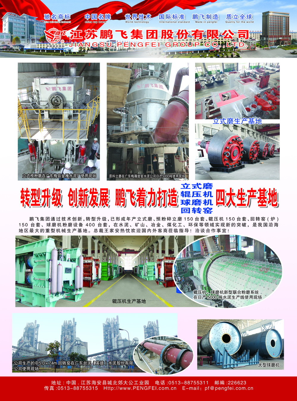 鵬飛集團(tuán)通過技術(shù)創(chuàng)新,轉(zhuǎn)型升級(jí),已形成年產(chǎn)立式磨、預(yù)粉碎立磨150臺(tái)套、輥壓機(jī)150臺(tái)套、回轉(zhuǎn)窯(爐)150臺(tái)套、球磨機(jī)粉磨設(shè)備400臺(tái)套,在水泥、礦山、冶金、煤化工、環(huán)保等領(lǐng)域?qū)崿F(xiàn)新的突破,是我國(guó)沿海地區(qū)大型重型機(jī)械生產(chǎn)基地。總裁王家安熱忱歡迎國(guó)內(nèi)外客商蒞臨指導(dǎo)!洽談合作事宜!