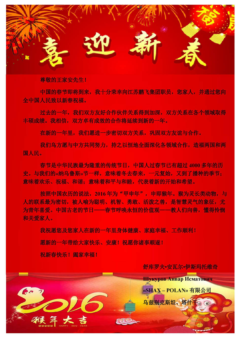 烏茲別克斯坦《SHAX-POLAN》有限公司給我公司發(fā)來新春賀電