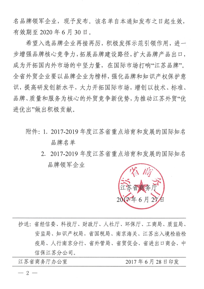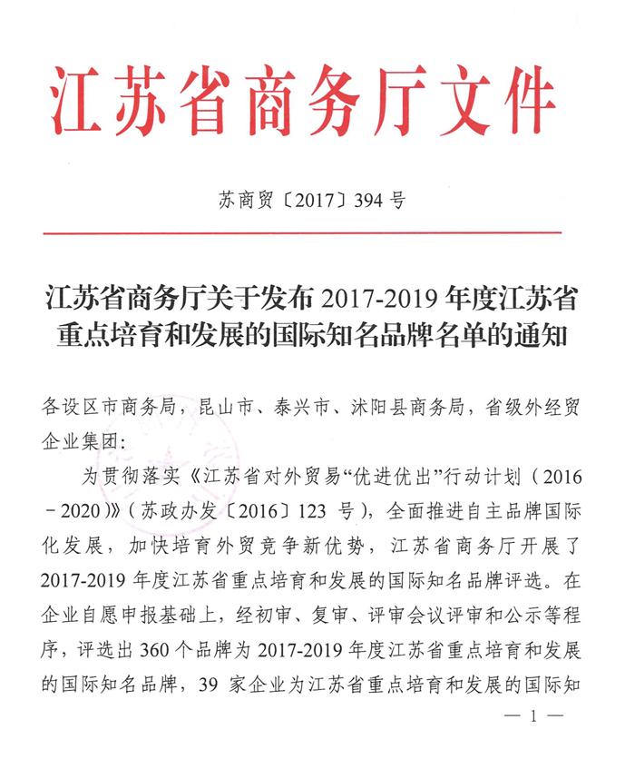 “鵬飛”入選江蘇省重點(diǎn)培育國際知名品牌名單