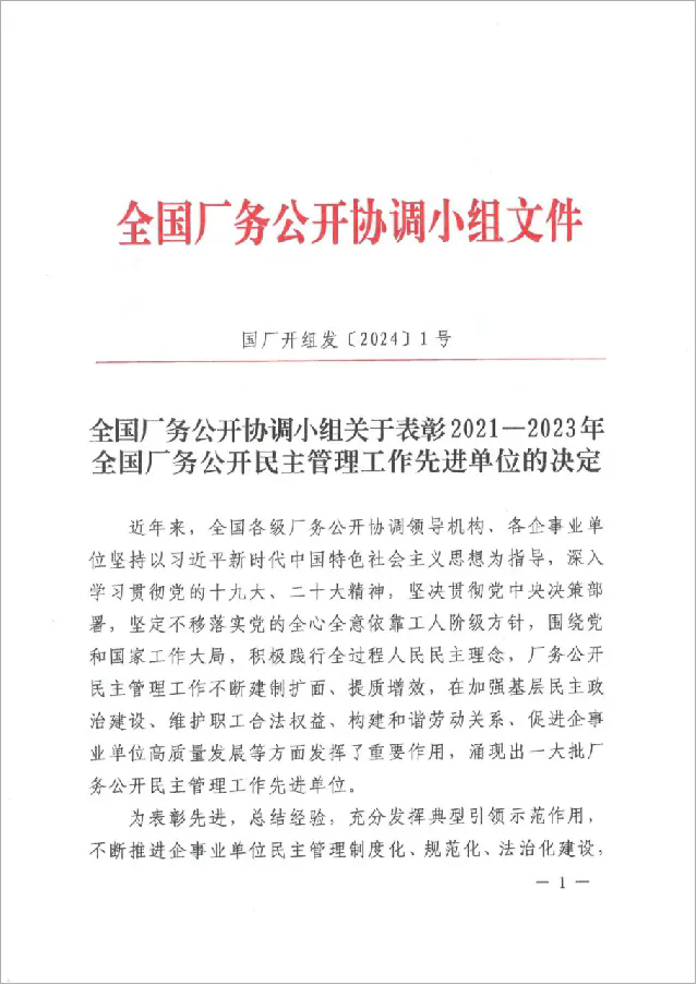近日,全國廠務公開協(xié)調小組印發(fā)《關于表彰2021-2023年全國廠務公開民主管理工作先進單位的決定》,江蘇鵬飛集團股份有限公司被表彰為全國廠務公開民主管理工作先進單位。