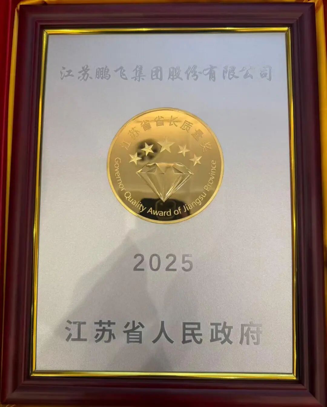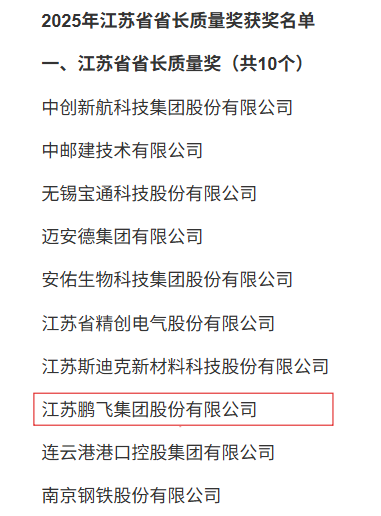 2月27日,2025年度江蘇省省長(zhǎng)質(zhì)量獎(jiǎng)?lì)C獎(jiǎng)儀式在南京舉行,省長(zhǎng)劉小濤為獲獎(jiǎng)企業(yè)頒獎(jiǎng),充分肯定企業(yè)在質(zhì)量領(lǐng)域的深耕與卓越追求。江蘇鵬飛集團(tuán)股份有限公司作為獲獎(jiǎng)企業(yè)之一,董事長(zhǎng)王家安上臺(tái)領(lǐng)獎(jiǎng)。