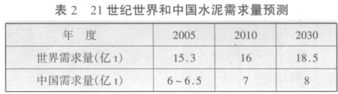 21世紀(jì)世界和我國水泥的生產(chǎn)與消費仍將保持一定速度增長,但不是很高。表 2 是世界和中國水泥需求量的預(yù)測。