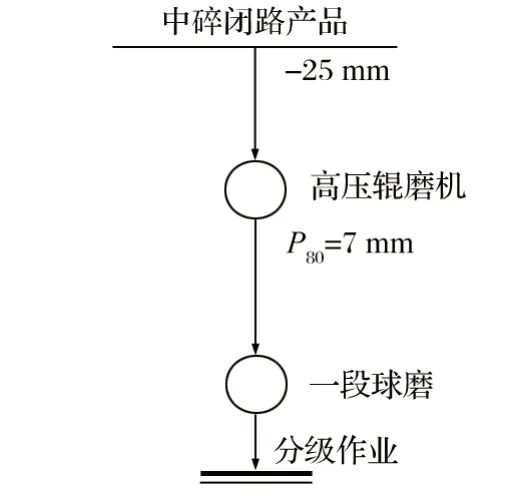 該鉬礦結(jié)合多年現(xiàn)場(chǎng)生產(chǎn)實(shí)踐,選取有代表性礦樣進(jìn)行試驗(yàn)。礦樣由硬礦、中等硬度礦和軟礦組成,根據(jù)地質(zhì)模型和采礦排產(chǎn)計(jì)劃,3 種礦樣按比例4∶4∶2 進(jìn)行配礦。對(duì)配好礦樣進(jìn)行 3 種高壓輥磨工藝流程的試驗(yàn)研究,獲得其產(chǎn)品粒度和邦德功指數(shù)參數(shù)。實(shí)驗(yàn)室采用 1 臺(tái) CLM25