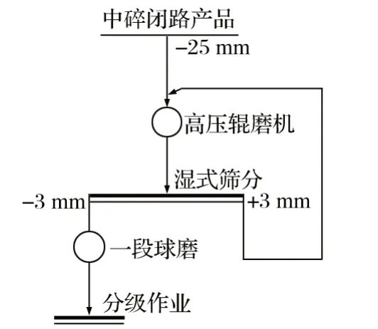 /d 生產(chǎn)系統(tǒng)設(shè)備陳舊,且設(shè)備規(guī)格小、數(shù)量多,管理和維護(hù)工作量大,因此擬對(duì)碎磨流程進(jìn)行技術(shù)升級(jí)改造。通過(guò)初步調(diào)研和分析,擬采用高壓輥磨機(jī)進(jìn)行碎磨系統(tǒng)改造,實(shí)現(xiàn)單系列生產(chǎn)能力達(dá)到 10 000 t