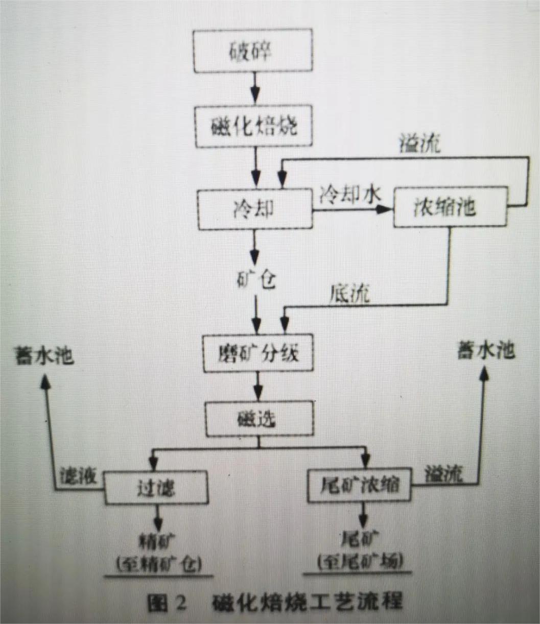 炙熱的菱鐵礦如果接觸氧氣很容易轉化為r-Fe2O3 ,甚至弱性的a-Fe2O3 ,導致弱磁選困難,為了防止焙燒礦在出窯時弱磁性赤鐵礦,故焙燒礦出窯方案設計為水封拉鏈水冷,出水溫度一般為70°C 左右。然后進料倉,再經(jīng)過磨碎分級進行磁選,選出精礦粉。