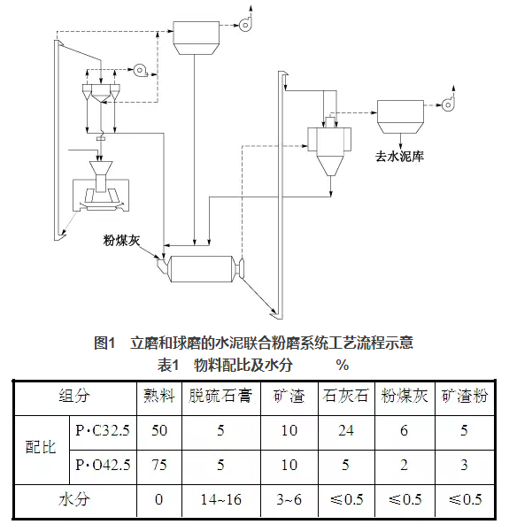 淶水冀東水泥有限公司3個(gè)水泥粉磨系統(tǒng)均采用JLMS-24.3立磨與Φ4.8m×9.5m球磨機(jī)組成聯(lián)合粉磨系統(tǒng)。JLMS-24.3立磨裝機(jī)功率2240kW,磨盤中徑2400mm,3個(gè)磨輥,磨盤轉(zhuǎn)速33.58r/min,產(chǎn)量210t/h,入料粒度≤30mm;配套選粉機(jī)JXF4100GY,成品量180~220t/h,比表面積≥200m2/kg,最大喂料量600t/h,通過氣體溫度≤150℃,通風(fēng)量(70~90℃)180000m3/h;球磨機(jī)Φ4.8m×9.5m,裝機(jī)功率3550kW,產(chǎn)量180t/h,生產(chǎn)P·O42.5水泥時(shí),比表面積360~380 m2/kg;配套O-Sepa選粉機(jī),通風(fēng)量240000m3/h,最大通過量720t/h。水泥粉磨系統(tǒng)工藝流程見圖1,系統(tǒng)設(shè)計(jì)指標(biāo):生產(chǎn)P·O42.5水泥,臺時(shí)產(chǎn)量180t/h,分步電耗35.5kWh/t,比表面積360m2/kg,生產(chǎn)P·C32.5水泥,臺時(shí)產(chǎn)量240t/h,分步電耗26.6kWh/t,比表面積370m2/kg。物料配比及相應(yīng)的水分情況見表1。