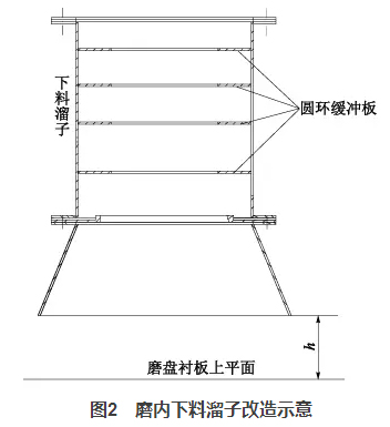 一方面它降低了入磨物料高落差對溜子的沖刷,另一方面圓環(huán)的收口作用使得物料的下料點(diǎn)發(fā)生了變化,將原先的單點(diǎn)偏心下料改成接近中心下料,改善了物料在磨盤上的偏離現(xiàn)象。同時(shí),適當(dāng)調(diào)整h值的大小(原設(shè)計(jì)600mm,最終改為400mm),使得下料波動時(shí),可以起到一定的緩沖作用,穩(wěn)定料床。