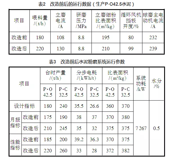通過以上幾個(gè)方面的整改,水泥粉磨系統(tǒng)的臺時(shí)產(chǎn)量有了明顯提升,表2是改造前后的運(yùn)行數(shù)據(jù),表3是水泥粉磨系統(tǒng)改造前后操作參數(shù)對照。