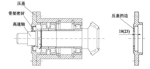 骨架密封厚度15mm,拆下壓蓋用車床將骨架密封擋邊車薄5mm,壓蓋密封槽深度由18mm加深到23mm(見(jiàn)圖4)。此法使得骨架密封在高速軸上的安裝位置向外移動(dòng)5mm,避開(kāi)高速軸上的溝槽。經(jīng)此處理,解決了漏油問(wèn)題,可以正常生產(chǎn),等到計(jì)劃?rùn)z修停機(jī)時(shí),再?gòu)氐滋幚砀咚佥S上的溝槽。