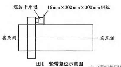 (1)輪帶復位。用四塊300mm×300mm×16mm的鋼板均勻布焊在一檔輪帶窯尾側(cè)距輪帶500mm處,作為支撐千斤頂?shù)牡鬃?/div>