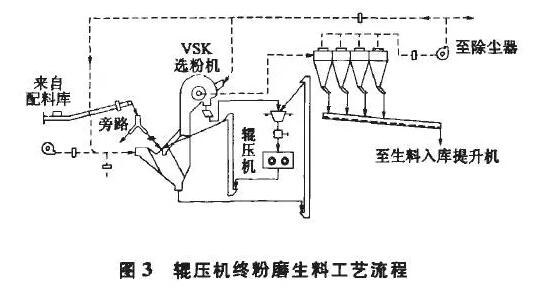 輥壓機(jī)終粉磨生料工藝流程圖見(jiàn)圖3.