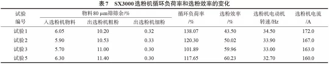 SX3000型選粉機(jī)系統(tǒng)循環(huán)負(fù)荷率和選粉效率對(duì)比見(jiàn)表7。