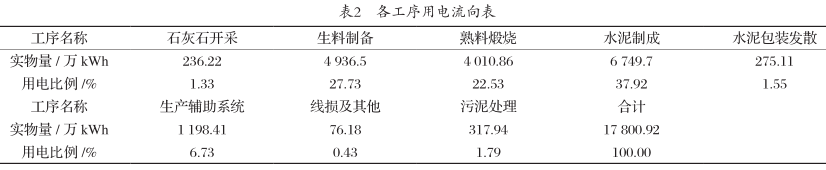 水泥企業(yè)電力消耗主要是設(shè)備動力拖動,一部分由社會電網(wǎng)提供,另外一部分由企業(yè)余熱發(fā)電廠提供。2018年企業(yè)外購電力13 688.15 萬kWh,余熱自發(fā)電4 112.77 萬kWh,合計17 800.92 萬kWh全部用于水泥生產(chǎn)。各工序用電流向如表2所示。