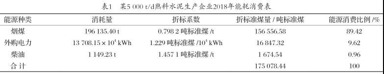 某水泥企業(yè),現(xiàn)有1條5000t/d新型干法水泥回轉(zhuǎn)窯生產(chǎn)線以及2臺180t/h水泥磨,具有年產(chǎn)普通硅酸鹽水泥熟料150萬t和年產(chǎn)硅酸鹽水泥160萬t的生產(chǎn)能力。主要產(chǎn)品為PO42.5和PS32.5A水泥。主要消耗的能源為煙煤、電力、柴油等。主要生產(chǎn)工序包括石灰石礦山開采、生料制備、熟料煅燒、水泥制成。2018年該企業(yè)綜合能耗為175078.44噸標(biāo)準(zhǔn)煤。主要能源消費情況如表1所示。